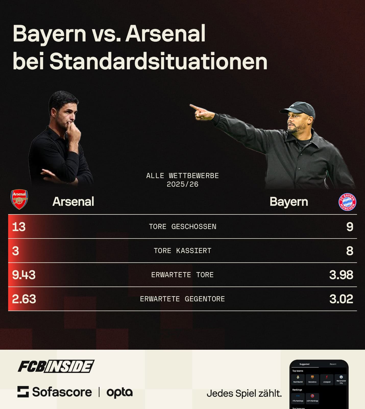 After the Freiburg game, the coach explained with regard to the Gunners: „They are the best team in Europe at set-pieces. I think that’s a good challenge. I don’t know if there are many better teams in Europe than Arsenal at the moment. We’re looking forward to the game.“ However, Munich have shown weaknesses at set-pieces of all things recently.