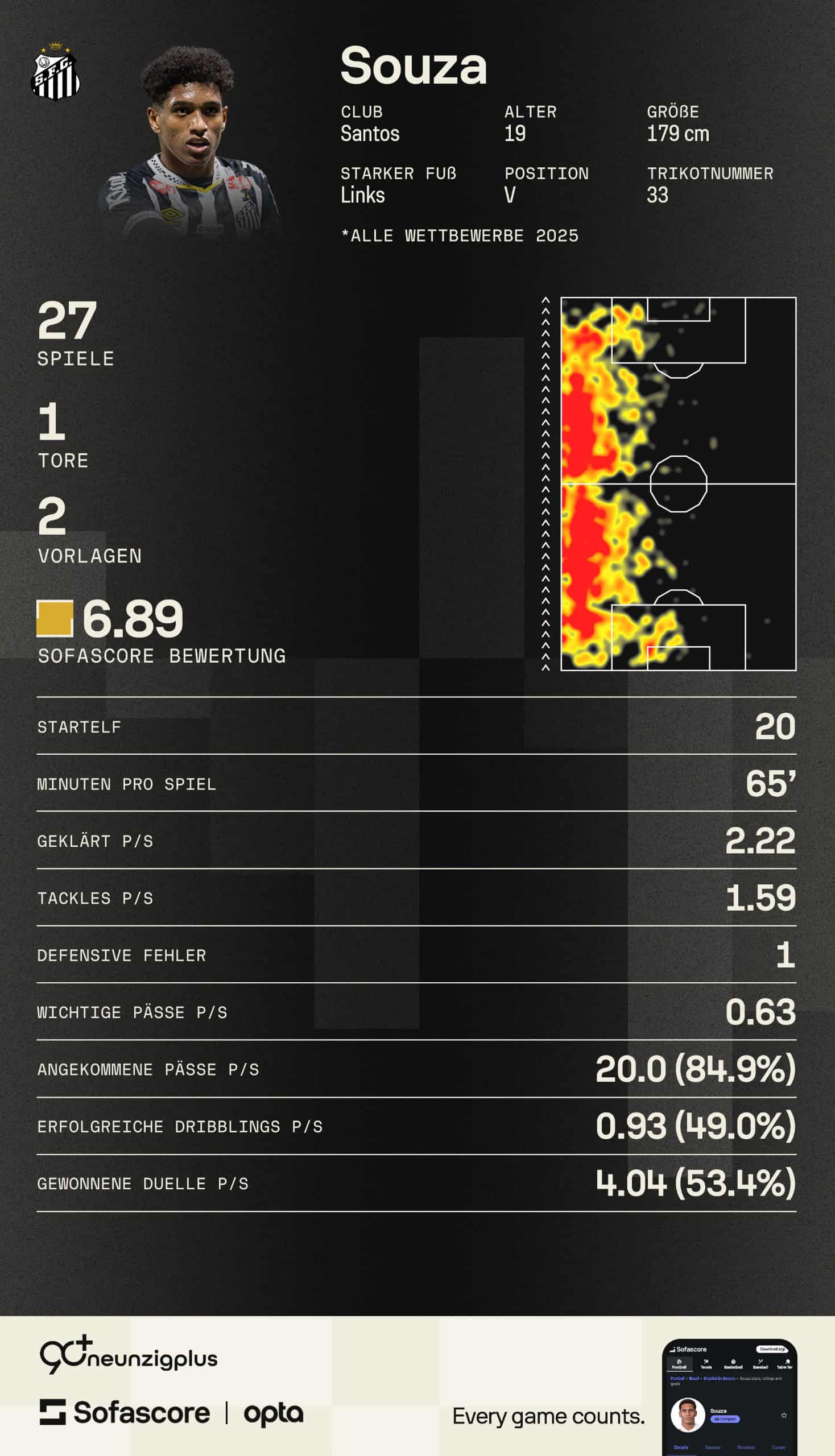 Particularly interesting: According to information from AS, Souza is said to have a fixed exit clause of 15 million euros. However, this only applies to a move to Europe. His current market value is estimated at three million euros. In view of Santos‘ financial situation, a sale is very likely