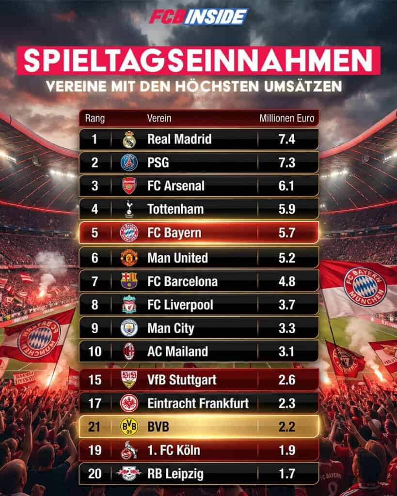 In the evaluation of total revenue per home game, FC Bayern ranks fifth in Europe with €5.7 million. Only Real Madrid, PSG, Arsenal and Tottenham are above the Munich club. This confirms that the Allianz Arena has long been one of the biggest revenue machines in world soccer. While other Bundesliga clubs remain below the three million mark, the gap to Bayern’s rivals is enormous. Stuttgart comes in at €2.6 million, Frankfurt and Dortmund only at around €2.2 to 2.3 million. Leipzig is even further behind with €1.7 million. Bayern thus takes in more than twice as much as any other German club and in some cases almost three times as much