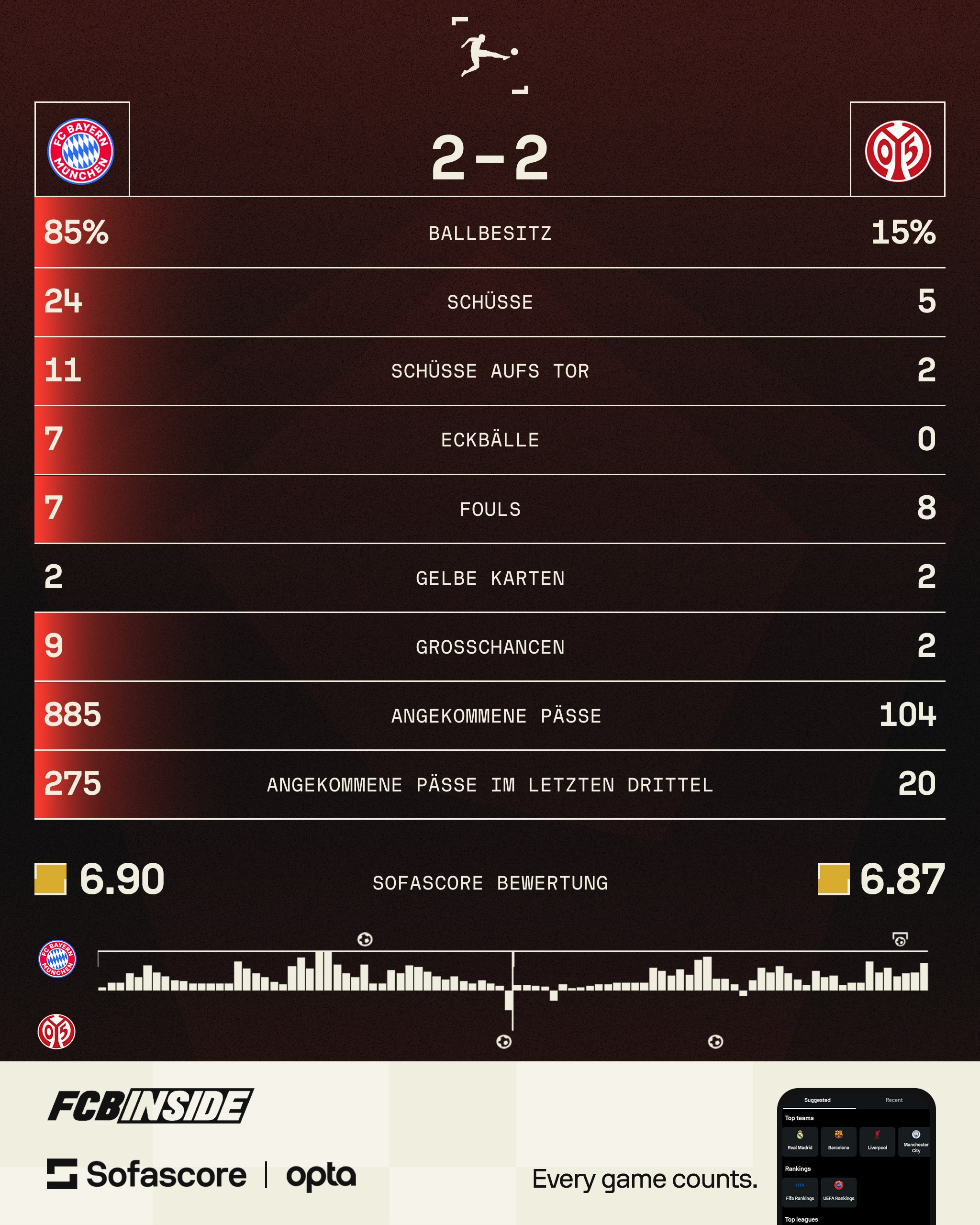 A statistical outlier match that seems almost inexplicable. Extreme dominance on the one hand, maximum efficiency on the other. For FC Bayern, a warning signal that control alone is not always enough. For Mainz 05, a historic evening – and a point that feels like a small miracle despite all the numbers.
