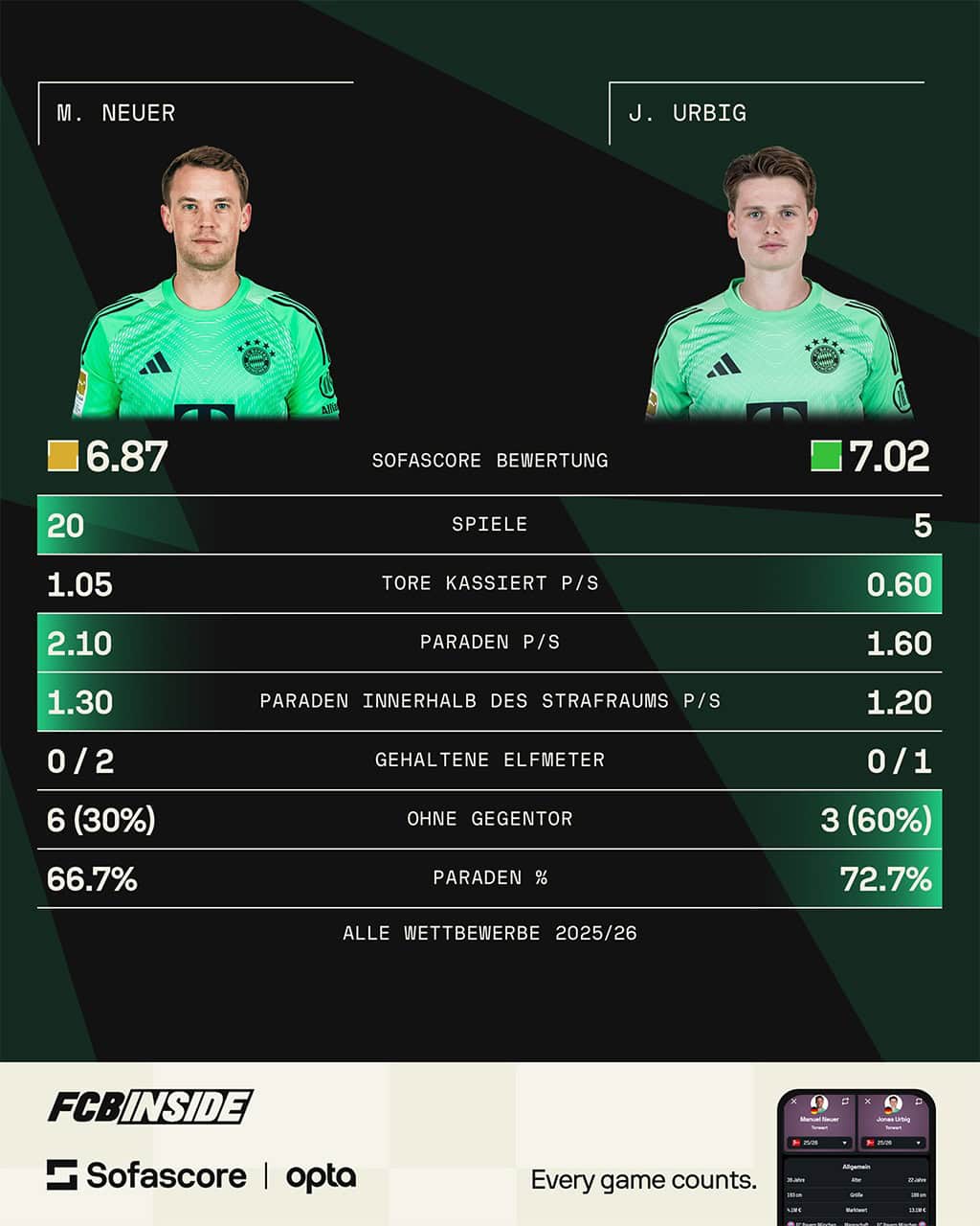There is still no discussion about the hierarchy. Neuer is at the front, Urbig behind. But the impressions of the first half of the season show that the clock is ticking. Urbig has everything it takes to be more than a solid substitute in the medium term. The facts already speak in his favour: better odds, higher rating, strong development.