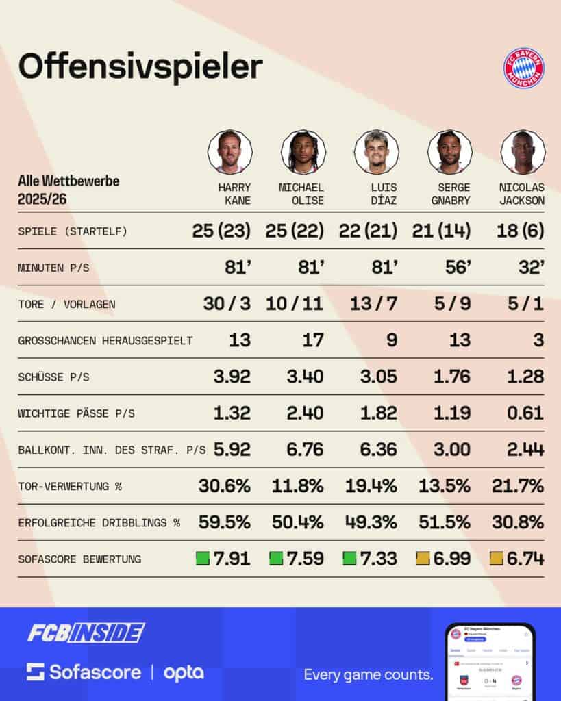 Bayern’s attack is currently being carried by three players in particular. Kane is scoring like an assembly line, Olise continues to play himself into focus and Díaz brings pace and commitment. Behind them, Gnabry and Jackson lack consistency or assertiveness. One thing is clear for the second half of the season: the front line is working, but more depth could make the difference. Jamal Musiala is another top-class player about to return, but the absence of Harry Kane is unlikely to be compensated for, at least for the knockout games in the top flight.