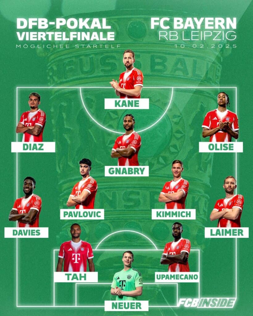 The likely Bayern starting XI at a glance: Neuer – Laimer, Upamecano, Tah, Davies – Kimmich, Pavlovic – Olise, Gnabry, Luis Diaz – Kane